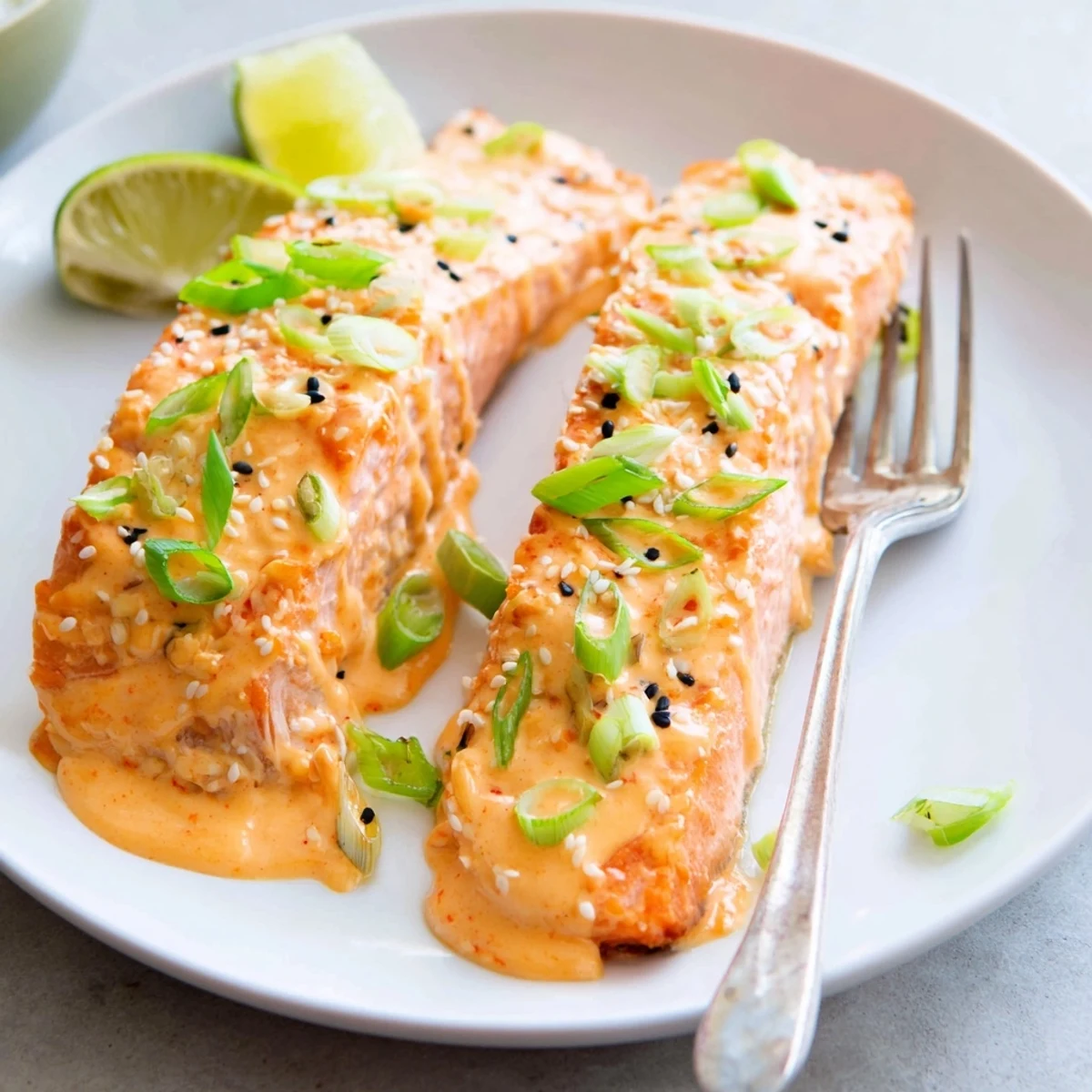 This Bang Bang Salmon features tender baked fillets coated in a rich, creamy sauce that balances sweet chili heat with sriracha spice. The salmon bakes in just 15 minutes while the sauce comes together in seconds with pantry staples. Perfect for weeknight dinners when you want something impressive but effortless.