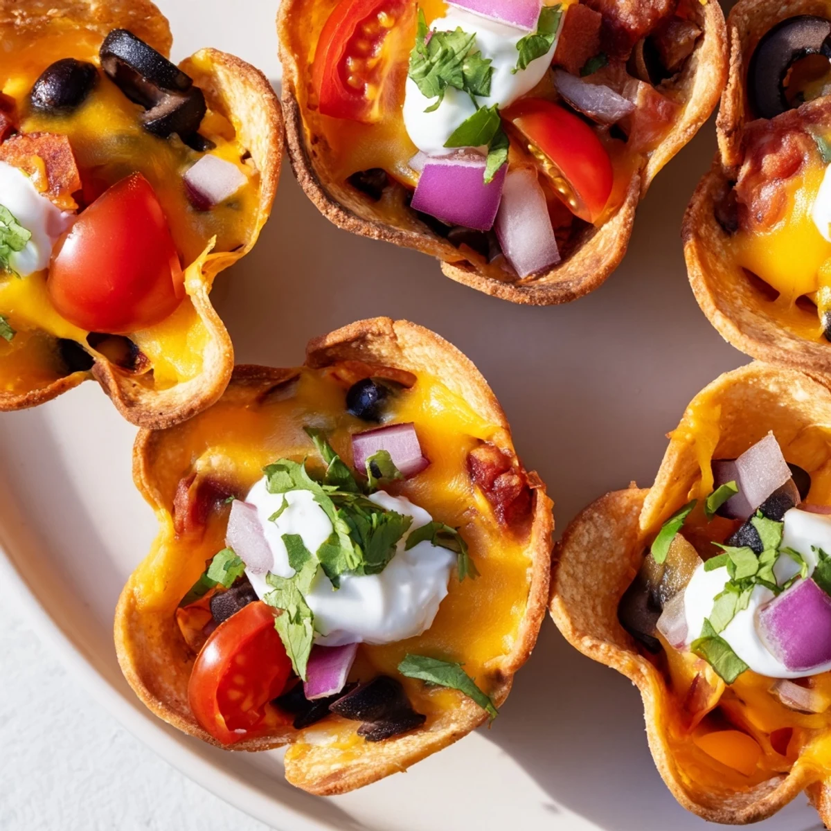 These individual nacho cups transform classic tortilla chips into edible vessels by baking them in a mini muffin tin until golden and sturdy. Each cup cradles a blend of sharp cheddar and creamy Monterey Jack that melts into bubbly perfection, topped with protein-rich black beans, sweet cherry tomatoes, briny black olives, and crisp red onion.