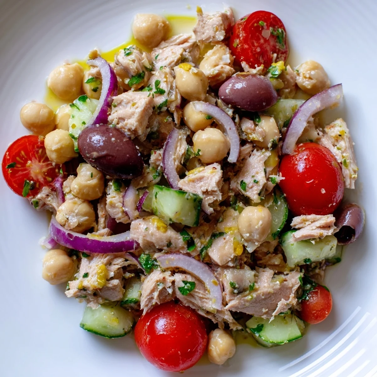 This Mediterranean-inspired salad combines protein-rich tuna and garbanzo beans with fresh cherry tomatoes, crisp cucumber, and savory red onion. The bright lemon-herb dressing brings everything together with extra-virgin olive oil, garlic, and oregano. Ready in just 15 minutes with no cooking required—perfect for meal prep or busy weekdays.