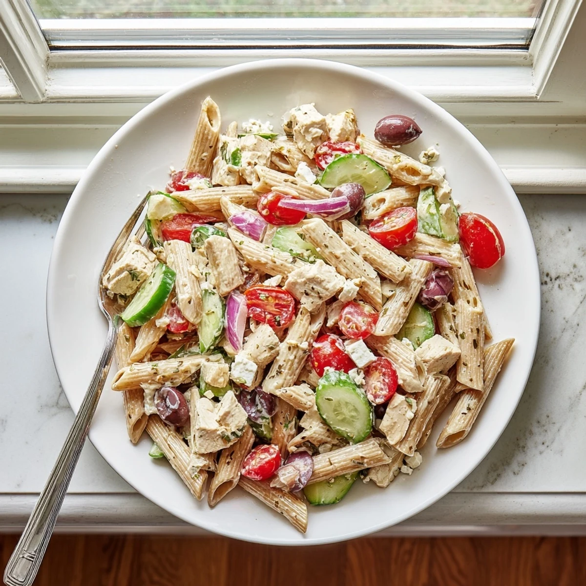 This vibrant Mediterranean bowl combines whole wheat pasta with tender chicken, creamy feta, and crisp vegetables in a tangy Greek yogurt dressing. The protein-rich ingredients make it incredibly satisfying, while fresh cucumbers, cherry tomatoes, and bell peppers add crunch and color. Ready in just 25 minutes, it's ideal for meal prep and tastes even better the next day as flavors meld together.