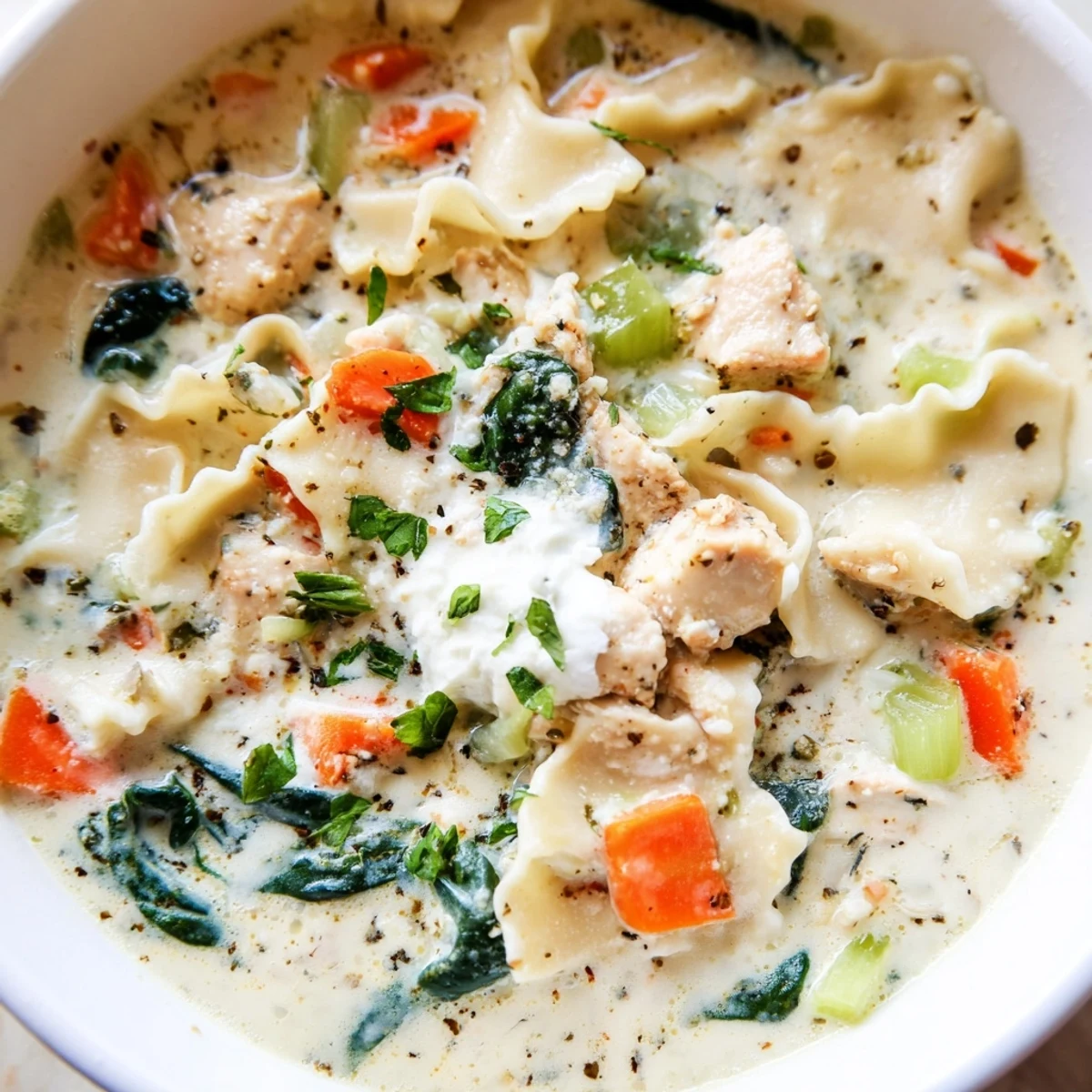 This comforting Italian-inspired soup combines all the flavors of classic white lasagna in a bowl. Tender chicken simmers with aromatic vegetables, broken lasagna noodles, and a rich broth infused with Italian herbs and red pepper flakes. The soup gets its signature creaminess from a blend of heavy cream, ricotta, mozzarella, and Parmesan that melts into the hot broth. Fresh spinach adds color and nutrients, while parsley brightens each serving.