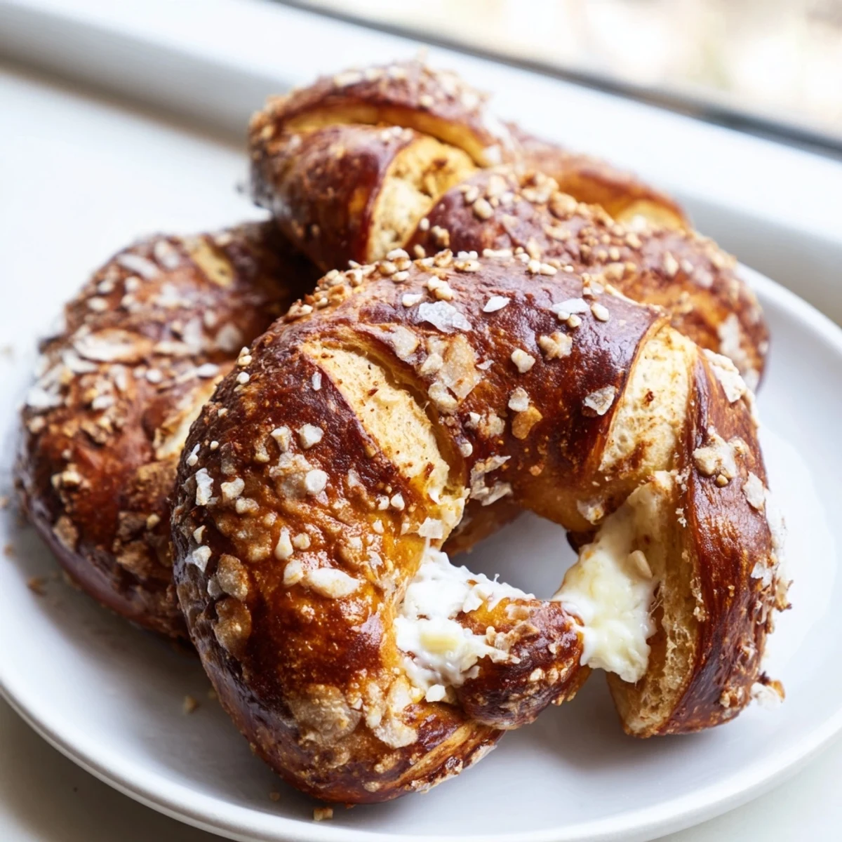 Shape them into traditional pretzel knots or keep them simple as stuffed bread sticks. Serve warm with marinara, ranch, or garlic butter for dipping. The egg wash creates a shiny exterior, while coarse salt delivers that authentic bakery taste.