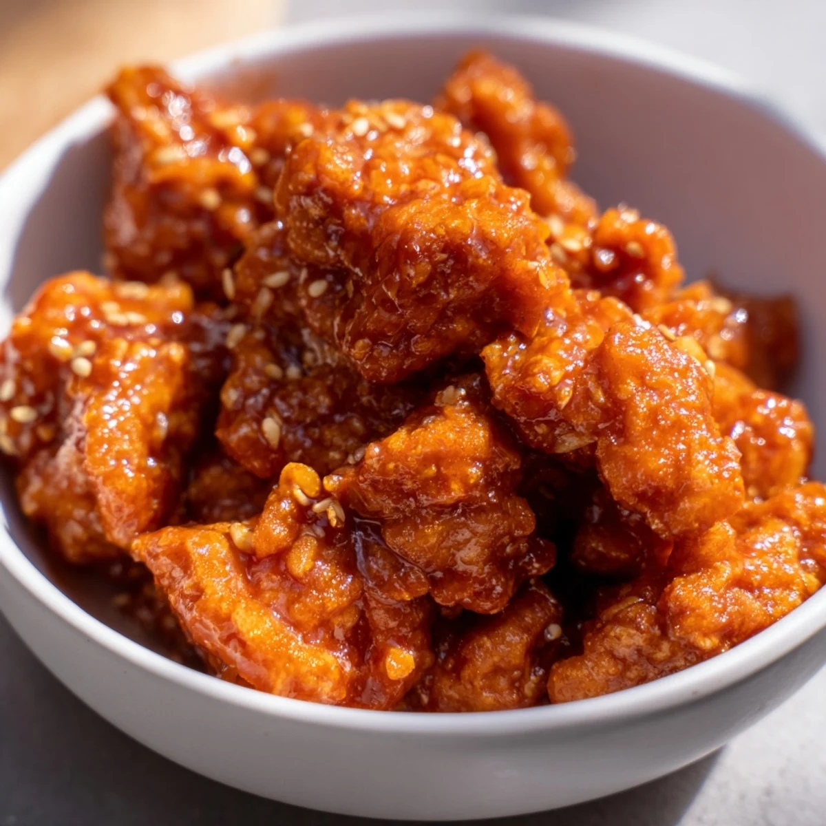 - Sprinkle sesame seeds over everything and add any toppings you love—fresh cilantro adds brightness, avocado brings creaminess. Serve immediately while the chicken is still hot and sticky.