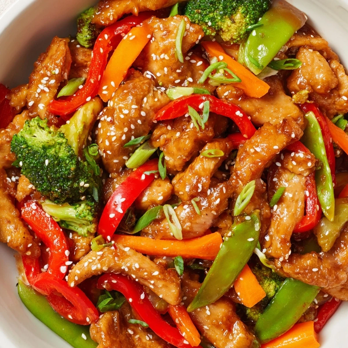 This vibrant dish brings together tender strips of chicken breast with colorful vegetables like red bell pepper, broccoli, carrots, and snap peas. The star is the luscious sauce—soy sauce, aromatic sesame oil, honey, rice vinegar, and a hint of heat from sriracha. Everything cooks quickly in a hot wok, achieving that perfect crisp-tender texture while the sauce thickens into a glossy coating. Ready in under 30 minutes, it's an ideal choice for busy weeknights when you crave something fresh and satisfying.