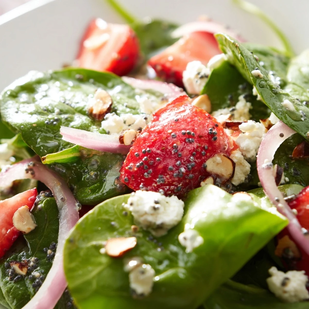 This vibrant bowl brings together juicy strawberries and crisp baby spinach with a homemade balsamic poppy seed dressing that strikes the perfect balance between sweet and tangy. Toasted almonds add satisfying crunch while crumbled feta brings creamy, salty notes that tie everything together.
