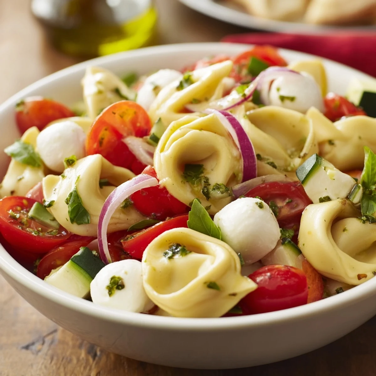 Cook the tortellini until al dente, rinse under cold water to stop the cooking process, and drain thoroughly. Toss with the dressing just before chilling, and avoid over-dressing as the pasta will absorb some liquid over time.